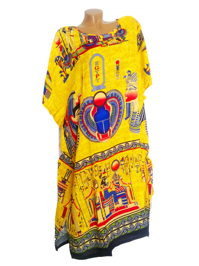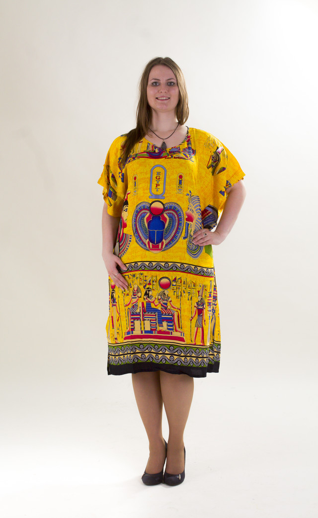 Легка бавовняна туніка-сукня. Яскраві соковиті кольори, малюнок у єгипетському стилі, м'яка та приємна тканина — все для того, щоб і на відпочинку ви мали чарівний вигляд і почувалися комфортно. Довжина 110 см, ширина 75 см, розмір універсальний 52-58, розрізи з боків. Тканина-шпапель