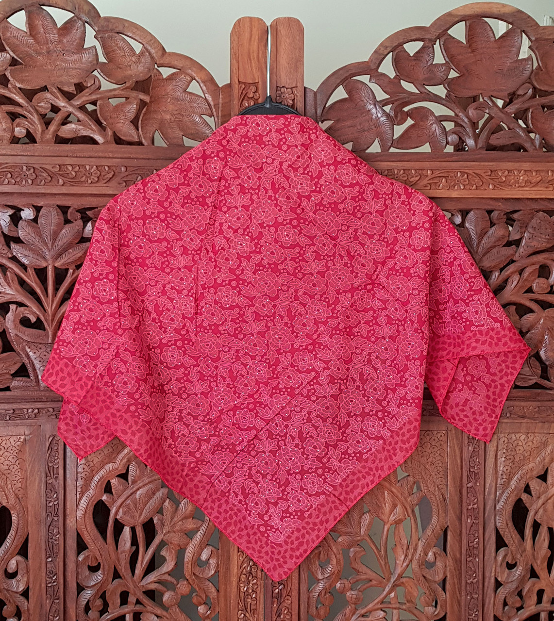 Чудова ніжна хустка з полікотону/поліестеру, за своїми якостями наближеного до бавовняної тканини/, дуже м'яка та приємна на дотик, не ковзає, немає відчуття синтетики. Розмір середній 72*72 см, можна носити і як головні хустки, і як середній.