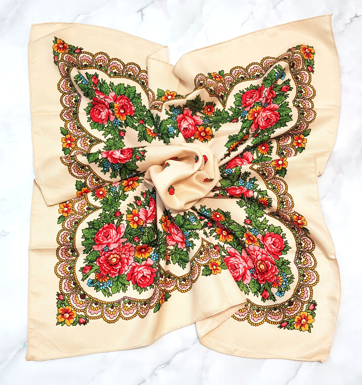 Хустка середня головна з приємного, м'якого полікотону з набивним малюнком, розмір 72*72 см. Ніжні квіткові візерунки, приємні тони.